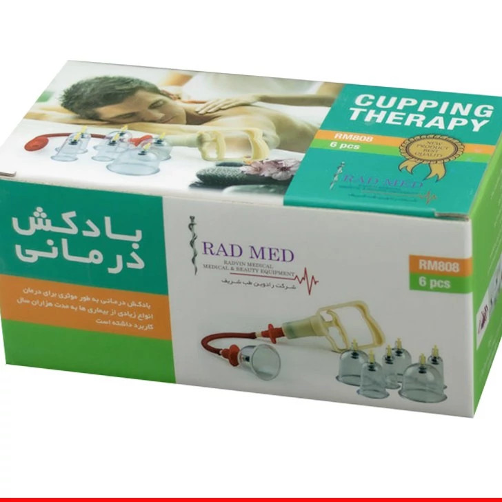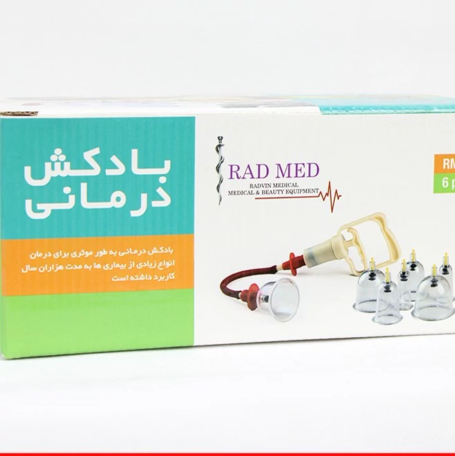 این بادکش 6 لیوانه با مکش قوی و دسته چهار انگشتی همراه با رابط شلنگ و کاتالوگ می باشد. یکی از روش های قدیمی که برای از بین بردن درد بدن استفاده می شده است بادکش درمانی بوده است. بادکش به دو دسته گرم و سرد می باشد که تاثیر بادکش گرم بیشتر از بادکش سرد است. علت هایی که باعث ایجاد درد در بدن می شوند مختلف هستند: یکی از این علت ها تجمع اسید لاکتیک و مواد زائد در مویرگ های سطح بدن است که خونرسانی به اعضا را مختل می کنند ، بادکش با ایجاد خلا باعث انبساط عروق سطحی و تجمع خون در موضع و در نتیجه خون رسانی بهتر به اعضای بدن می شود و به دنبال آن اکسیژن بیشتری به بافت ها رسیده و باعث کاهش درد و خستگی می شود. بادکش ها با خونرسانی به اعضای آسیب دیده باعث ترمیم زخم ها و بافت های آسیب دیده می شوند.